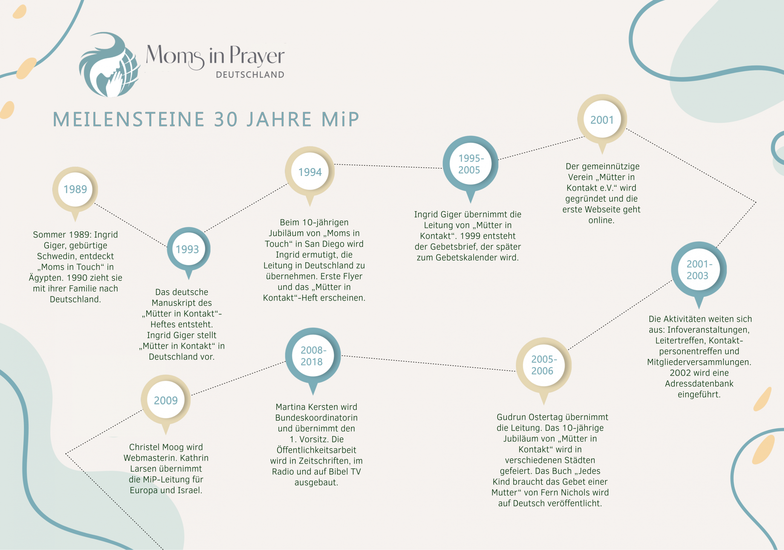 Im Sommer 1989 entdeckte die gebürtige Schwedin Ingrid Giger während ihres Aufenthalts in Ägypten “Moms in Touch”. Ein Jahr später zog sie mit ihrer Familie nach Deutschland – und legte damit den Grundstein für den Beginn dieser Bewegung im deutschsprachigen Raum. 1995 übernahm Ingrid Giger die Leitung von “Mütter in Kontakt”. Erstaunlich, wie Gott wirkte – dass über eine Schwedin in Ägypten diese Gebetsbewegung schließlich nach Deutschland kam!